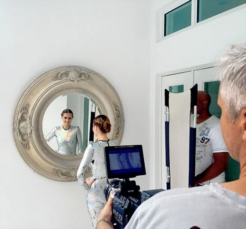 Wardrobe also played a big role and who better than Irina herself who gave me a tour of her closet and its contents. You can imagine a woman's closet and her collections of shoes from which to choose. Never underestimate the power of wardrobe and what it can do for your shoot/production. Her red dress and the silver performing outfit as seen in the video were perfect choices to demonstrate form and beauty in motion. In general, the color red is quite difficult to light correctly as it tends to look over saturated. This is where the strength of Sunbounce becomes the king and its selective variety of reflectors is the essence.